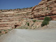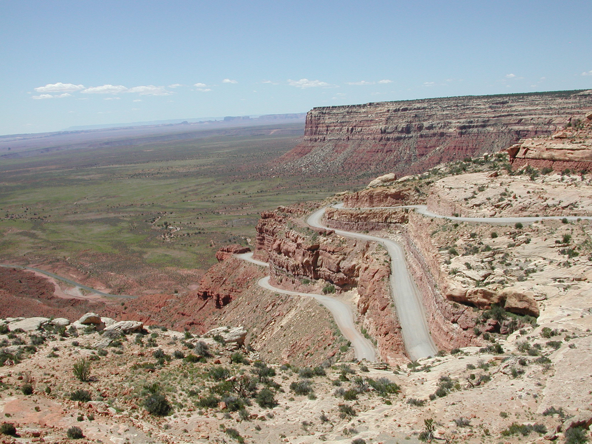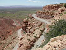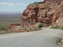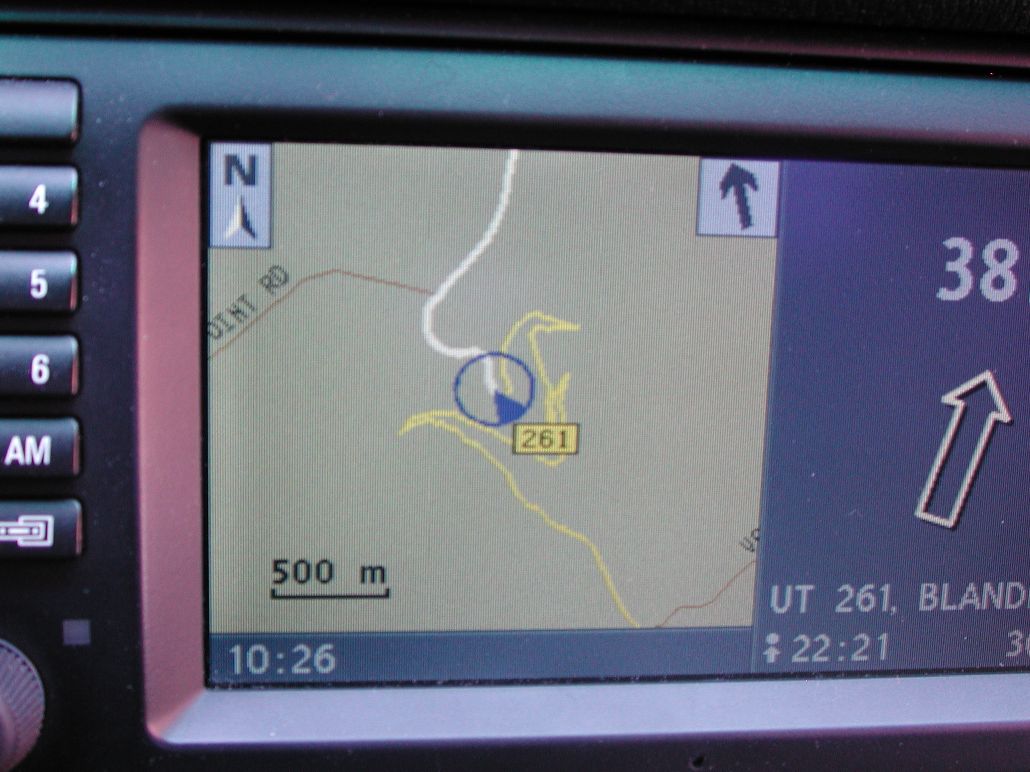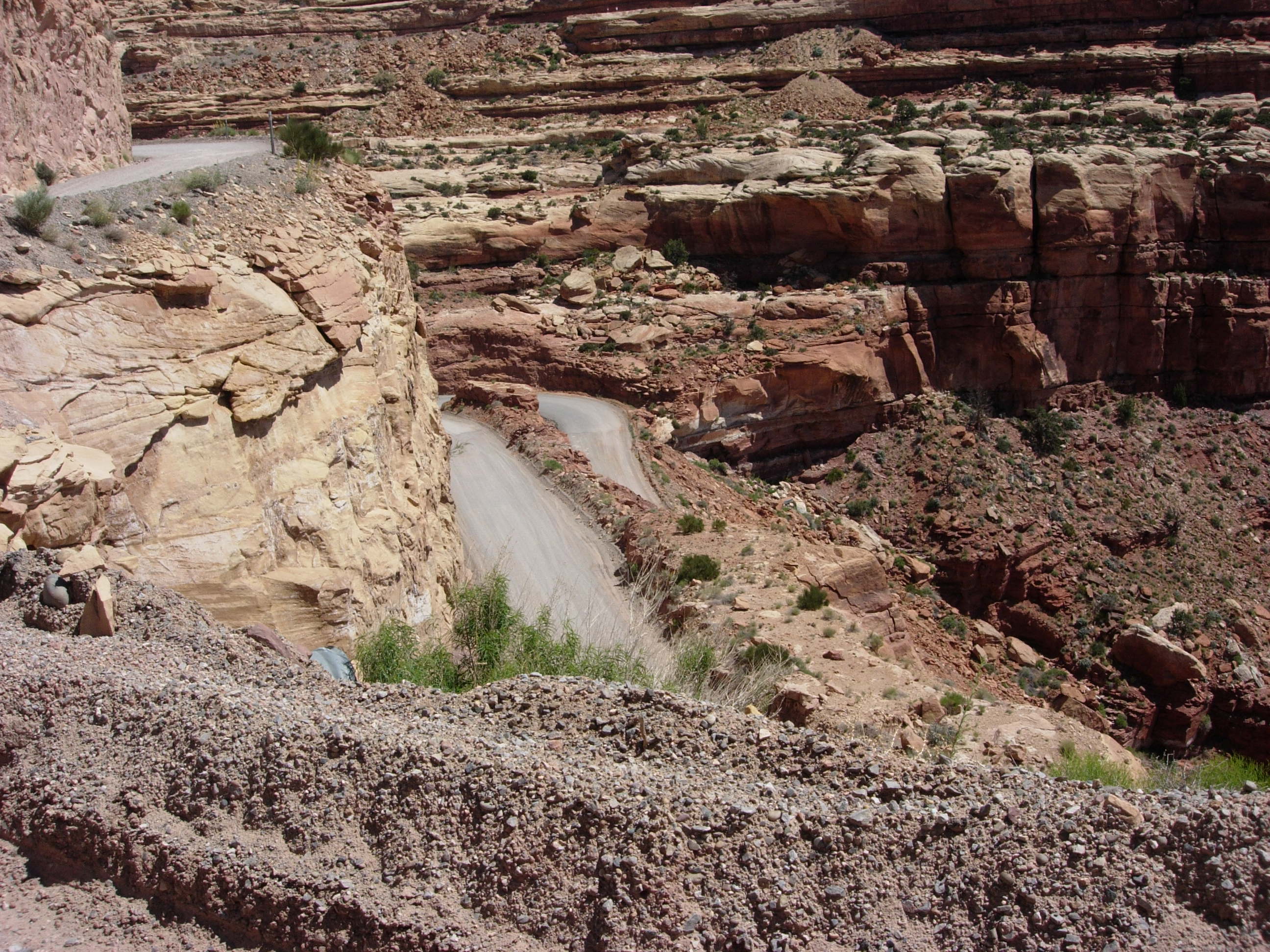 Time to point the nose west-bound and start heading back home. Got on 261, through Valley of the Gods and straight for the steep fault-line climbing hundreds of meters straight up ahead of us. The navigation map displayed an interesting pattern which supposedly was the part of the road we were heading for. The climb was very steep with the road carved into the cliff in narrow shelves, no rails and gravel in the hair-pins. Maybe this is why they don’t serve any alcohol around here?