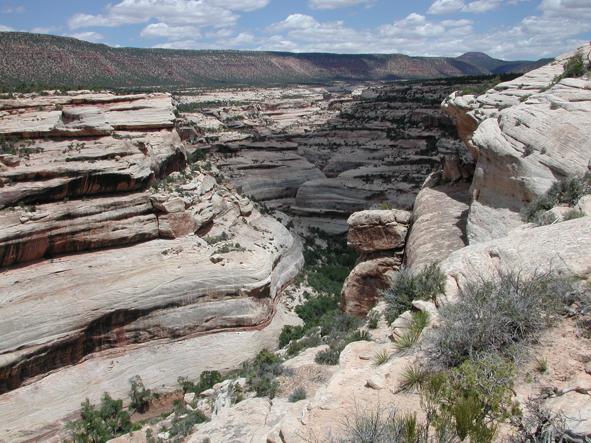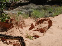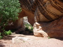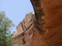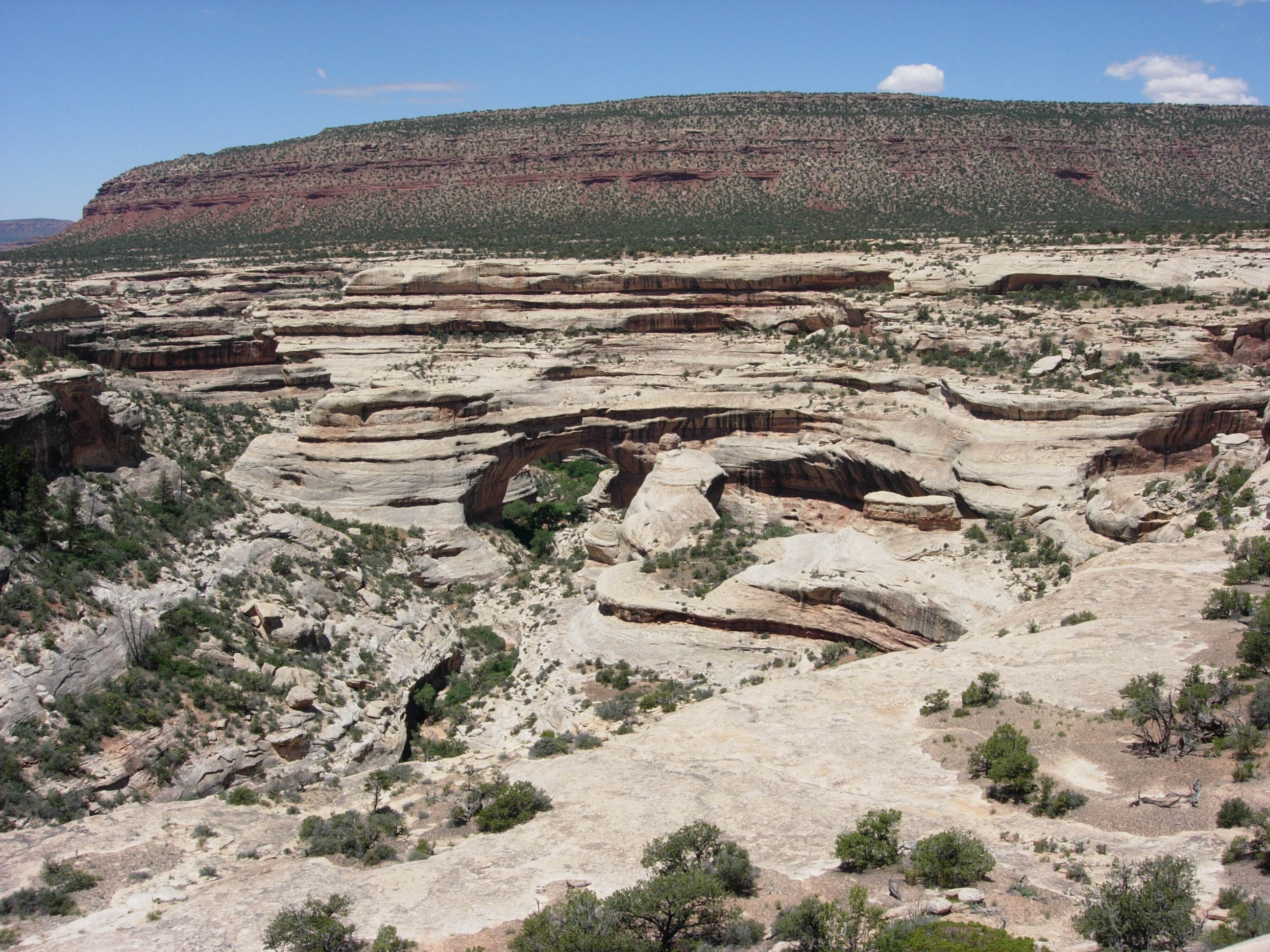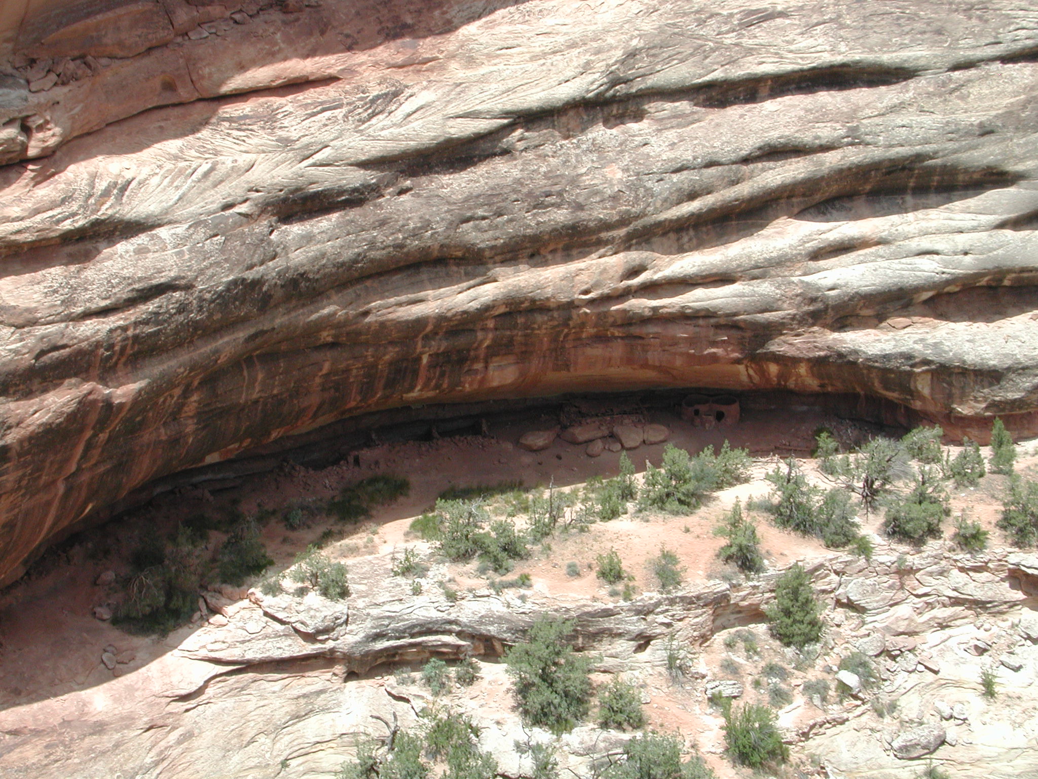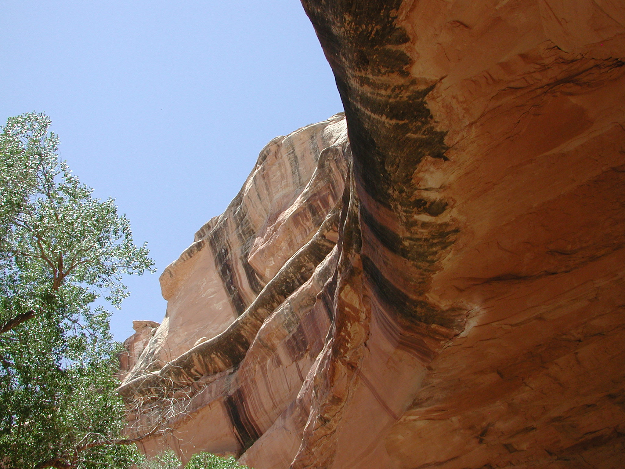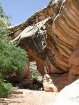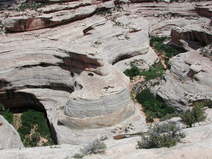 We got to the first natural bridge, Sipapu and walked the short distance to the look-out but turned down the six mile hike described. Drove a little further, took another slightly longer walk to check out the Horsecollar Ruins left by the Anasazi in the 1300’s that could be seen looking down towards the Canyon floor on the remote side. At the second bridge, the Kachina Bridge, we decides to take the 1.2km long walk descending 120m to get a close up acquaintance with the formation. It was fairly simple but steep at times to get down there. At the bottom of the canyon sand had formed a micro copy of canyon walls and a little water trickled in the sandy streambed leading to the arch. It was nice and cool down there and a pool of ice-cold water resided along with lush vegetation under the bridge. Taking our time in the Canyon, walking back and a brief stop at the third bridge, Owachomo, extended our Natural Bridges stay to a couple of well spent hours.