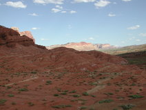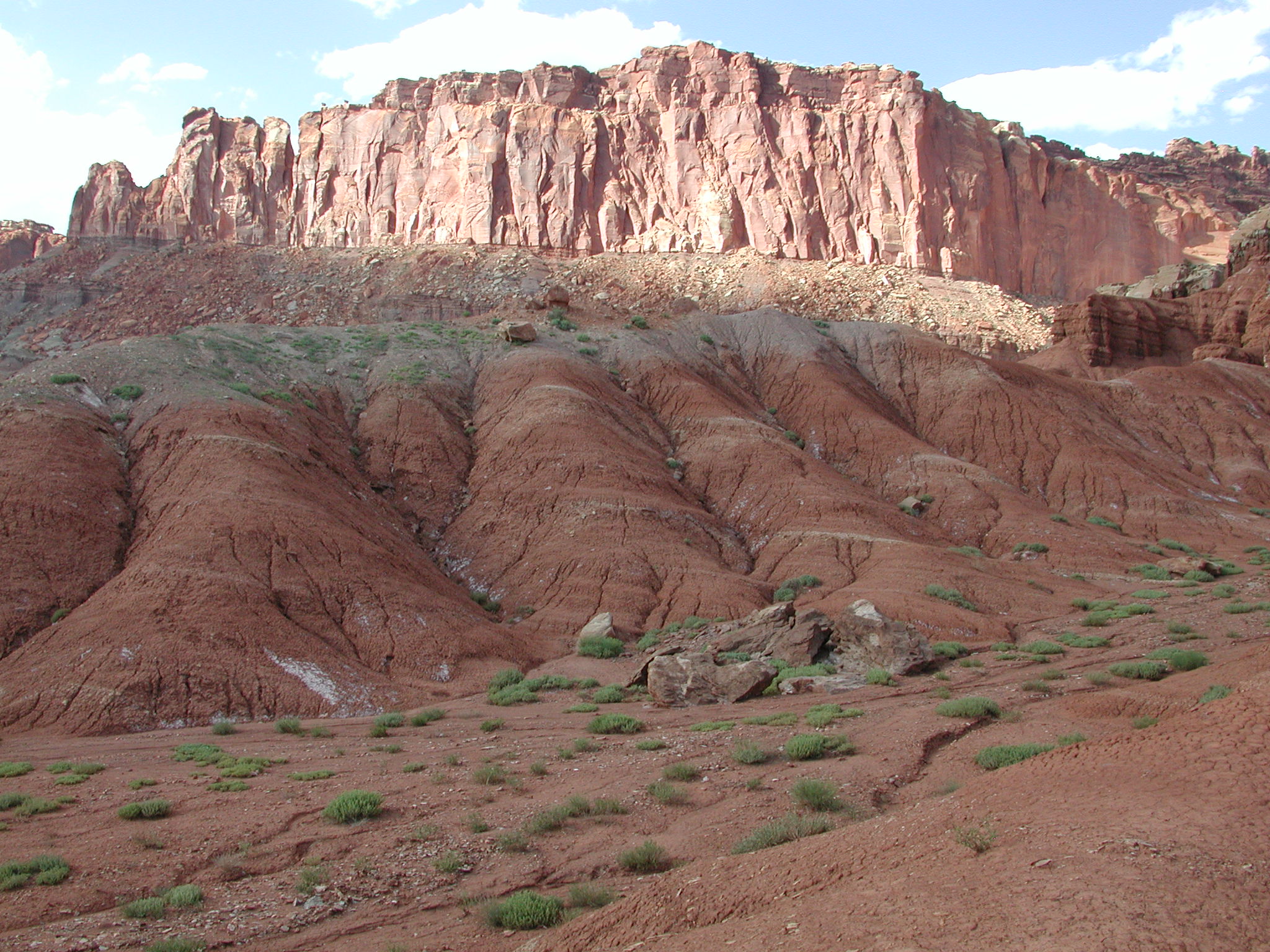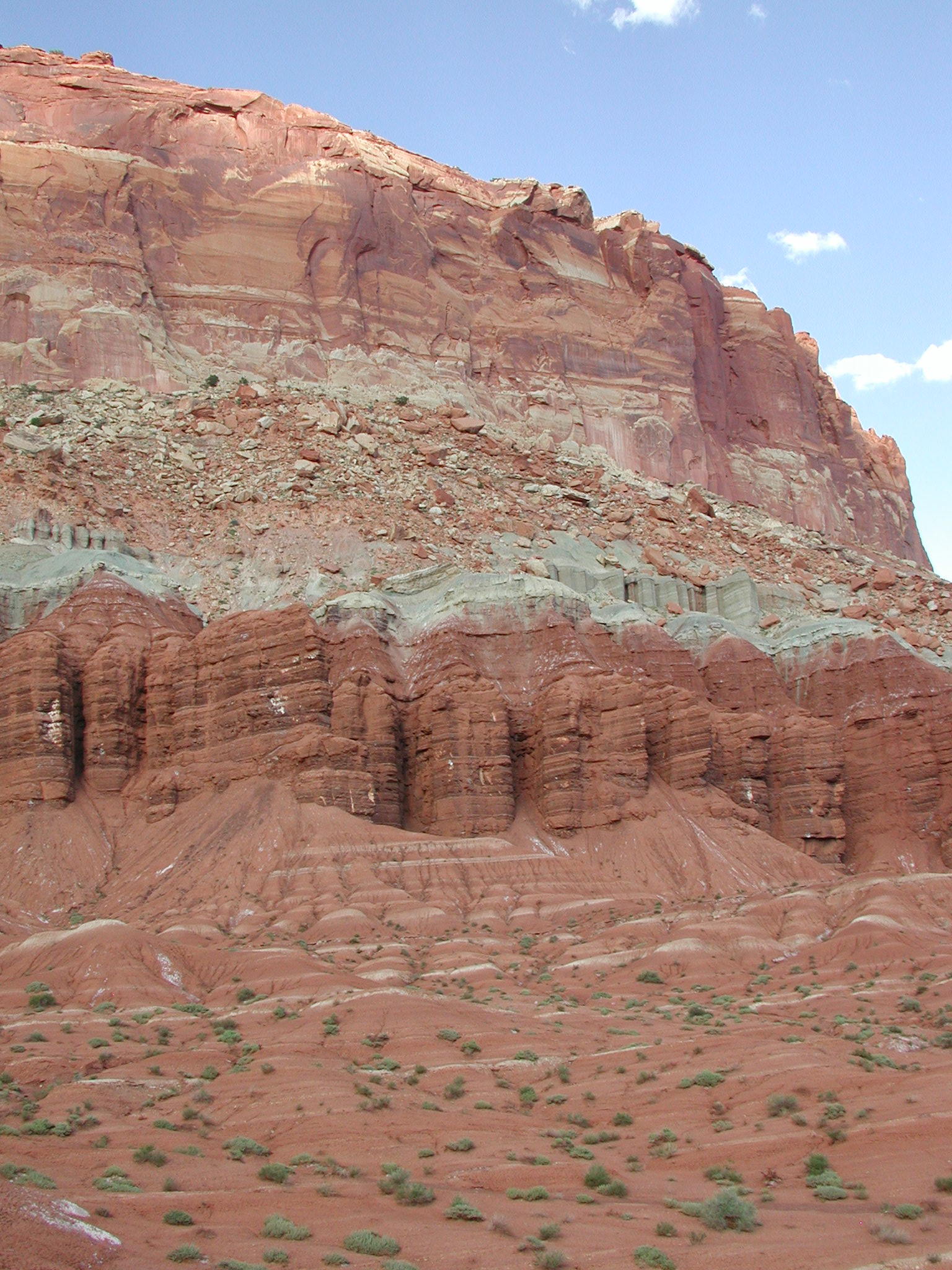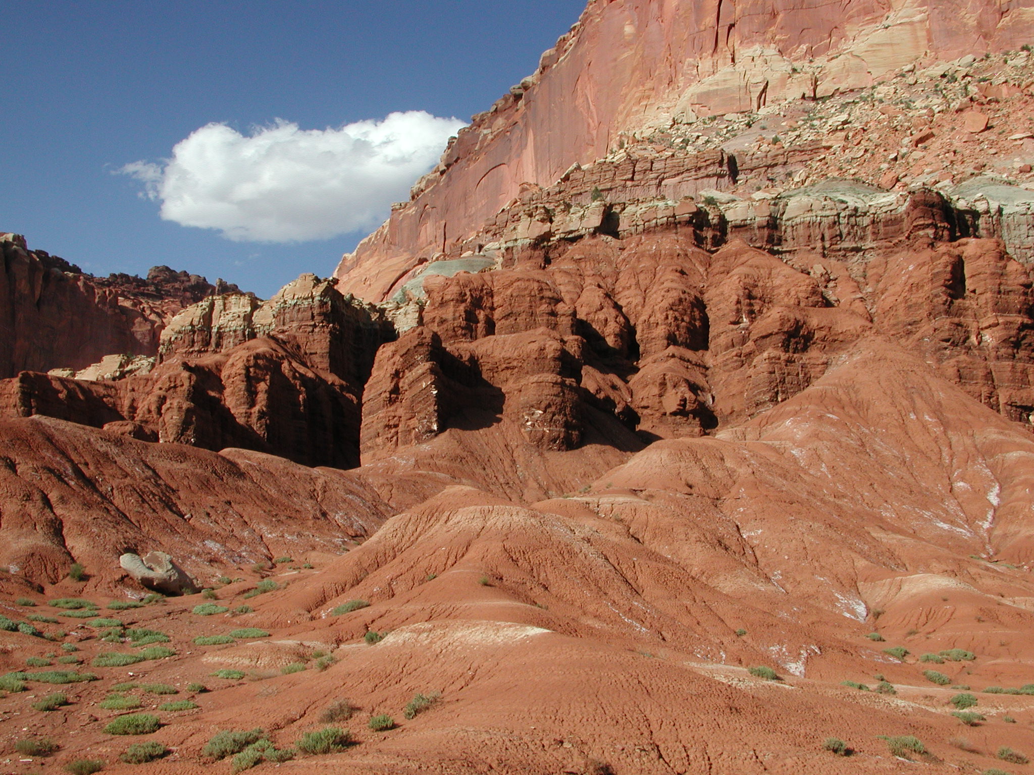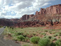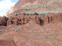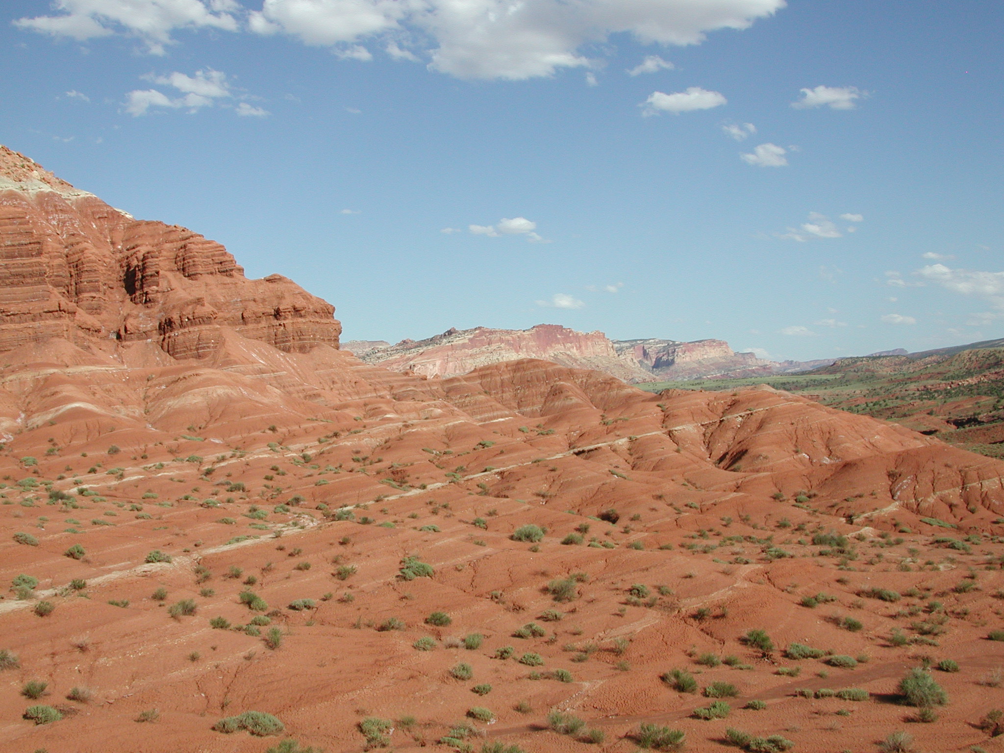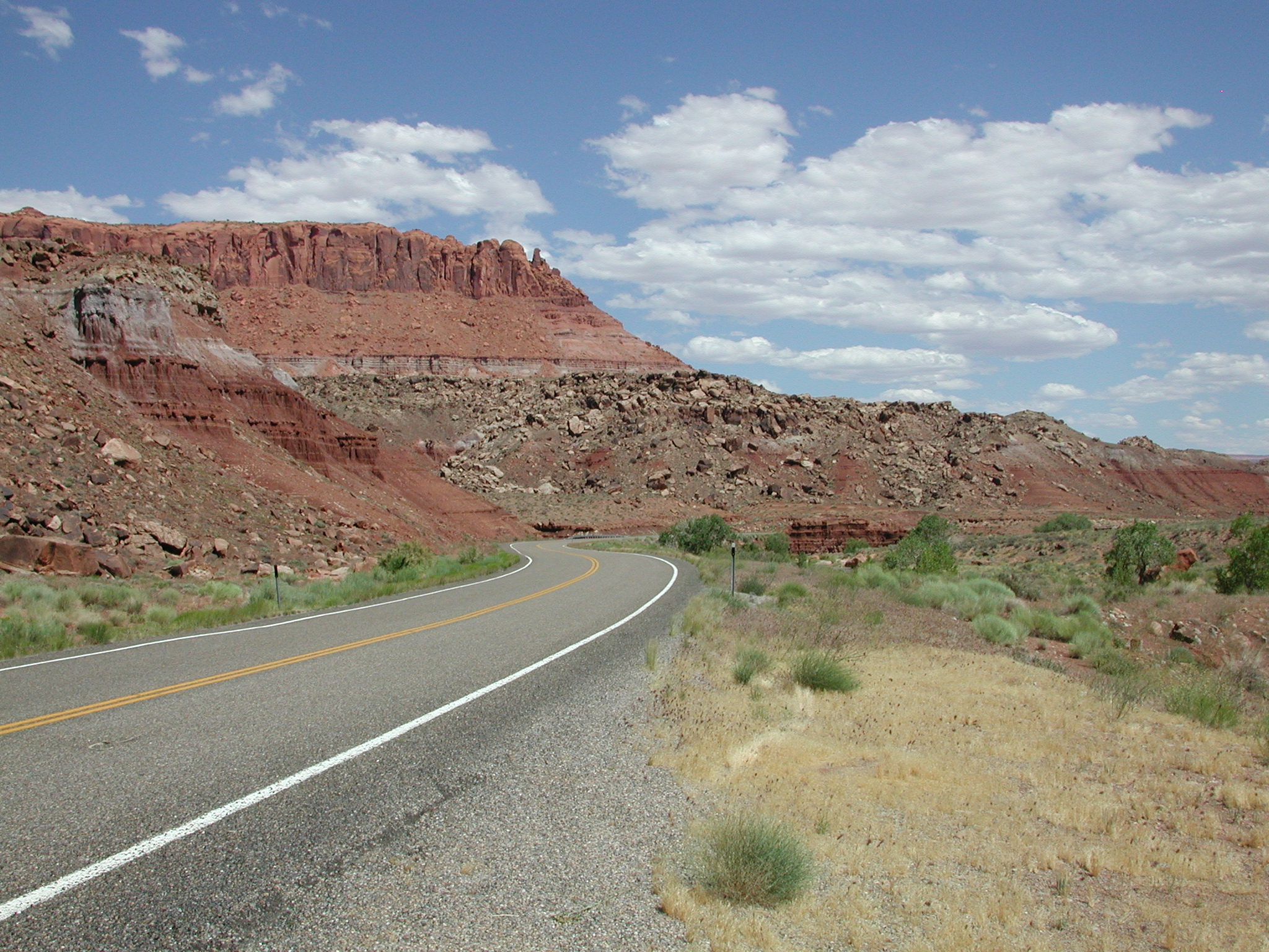 Hanksville, a boring little aggregate of houses and trailers in a dusty surrounding provided us with both gas and a well-needed lunch. Apparently another dry spot, not that it mattered as I had no desire to get drowsy, but rather acquire a little extra energy from the sweetness of a Coke. Food was good though and we set out for Richfield, but we gained distance well so the possibility of going further started to occur to us although it was not obvious to us where we would find accommodation beyond Richfield. Going west on 24 took us through another little wonder, Capitol Reef National Park with its bizarre clay-like soft round formations floating out from the feet of the steep rugged mountain sides. The road was winding softly through the valleys with a 45mph speed-limit and we took a rest-stop to climb the rounded rocks only to find out that they were soft like dried clay and buried zillion’s of crystal’s in aggregates as well as pink little stones at their base reminding me of cotton-balls.